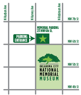 The Memorial Parking Garage is located at the corner of NW 6th and Harvey Ave. Entry to the garage is on Harvey Ave. just north of 6th. Parking is FREE with paid Museum admission on a first-come, first-serve basis. A parking validation is given at the admissions desk. The garage is $5 per hour without a validation.