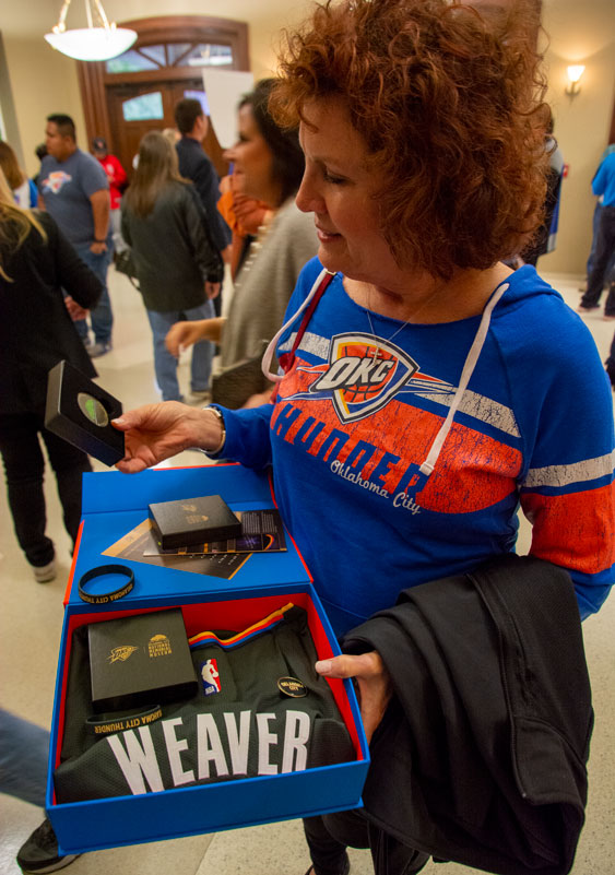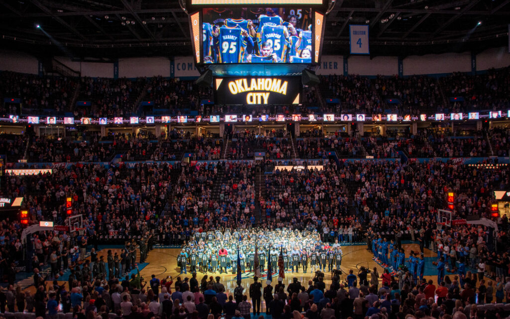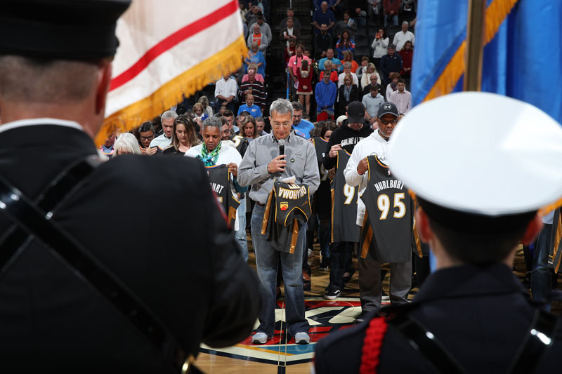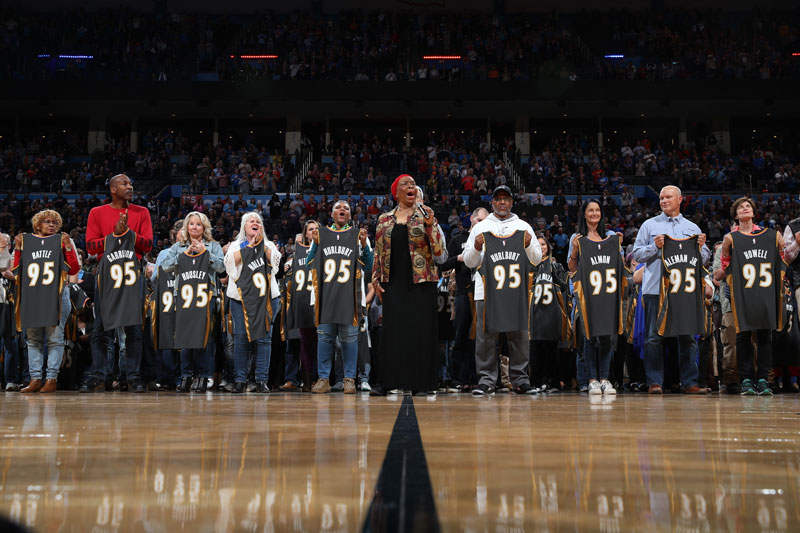 At tonight’s OKC Thunder game, representatives for each of the 168 who were killed, including some who flew or drove in from seven other states – spouses, kids, grandkids, great-grandkids, brothers, sisters, cousins and more – joined in a special unveiling of the Memorial City Edition uniform.