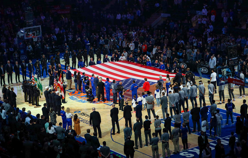 During the national anthem of the Oklahoma City Thunder vs New York Knicks game, the group held the flag in a touching moment of honor and unity.