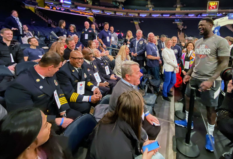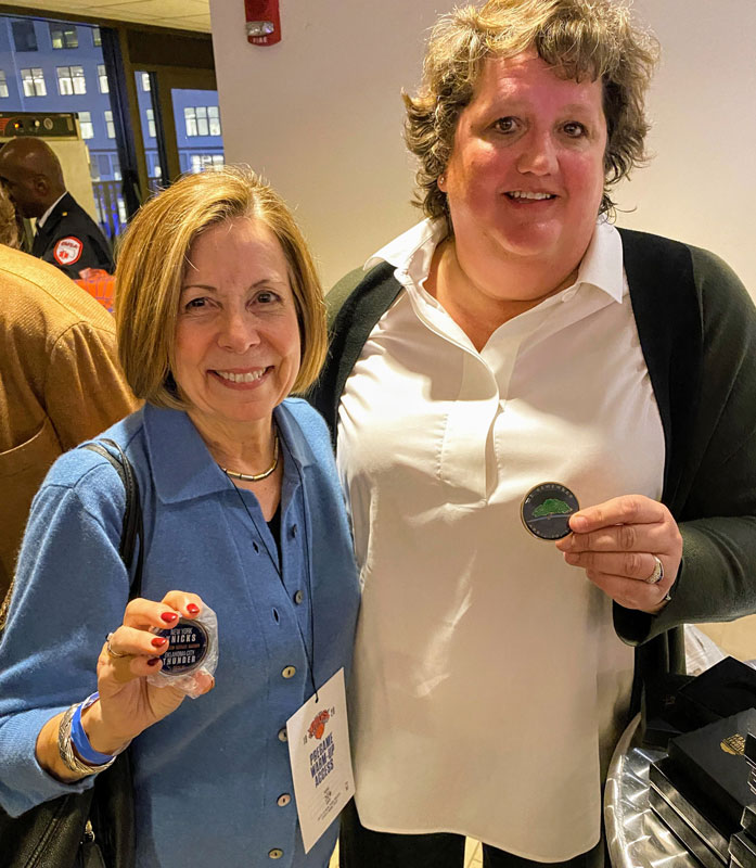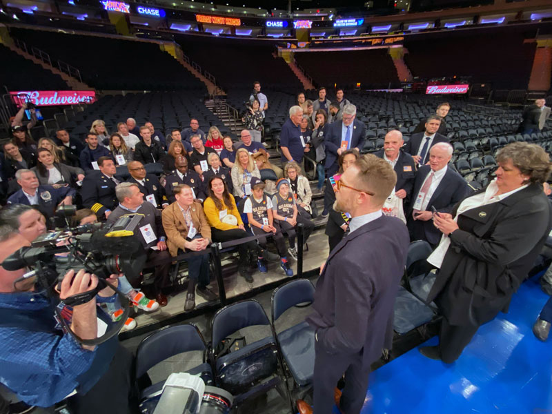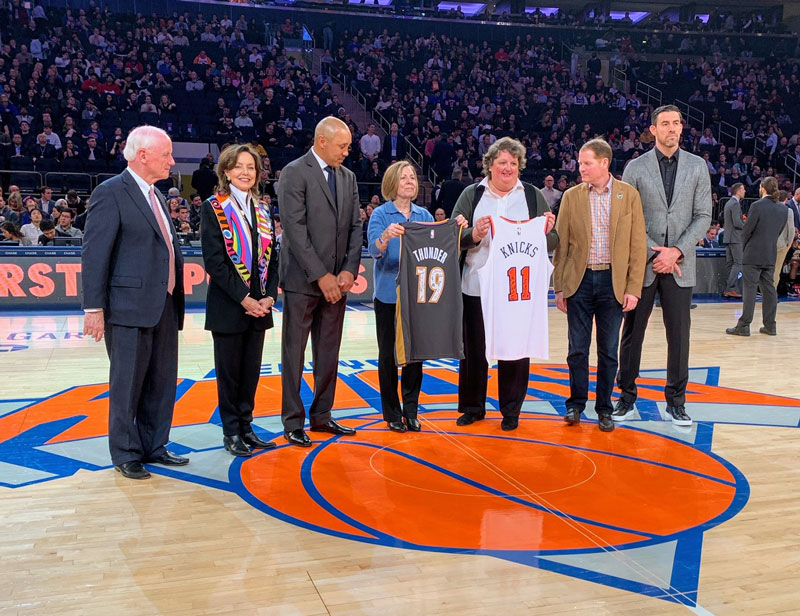 The Memorial Executive Director Kari Watkins and 9/11 Memorial CEO Alice Greenwald exchanged signed Thunder and Knicks jerseys. They were joined by Frank and Cathy Keating, Bob Ross, Nick Collison, and John Stocks. This exchange demonstrated the partnership and shared experience of the two great cities torn apart by terrorism but built back stronger.